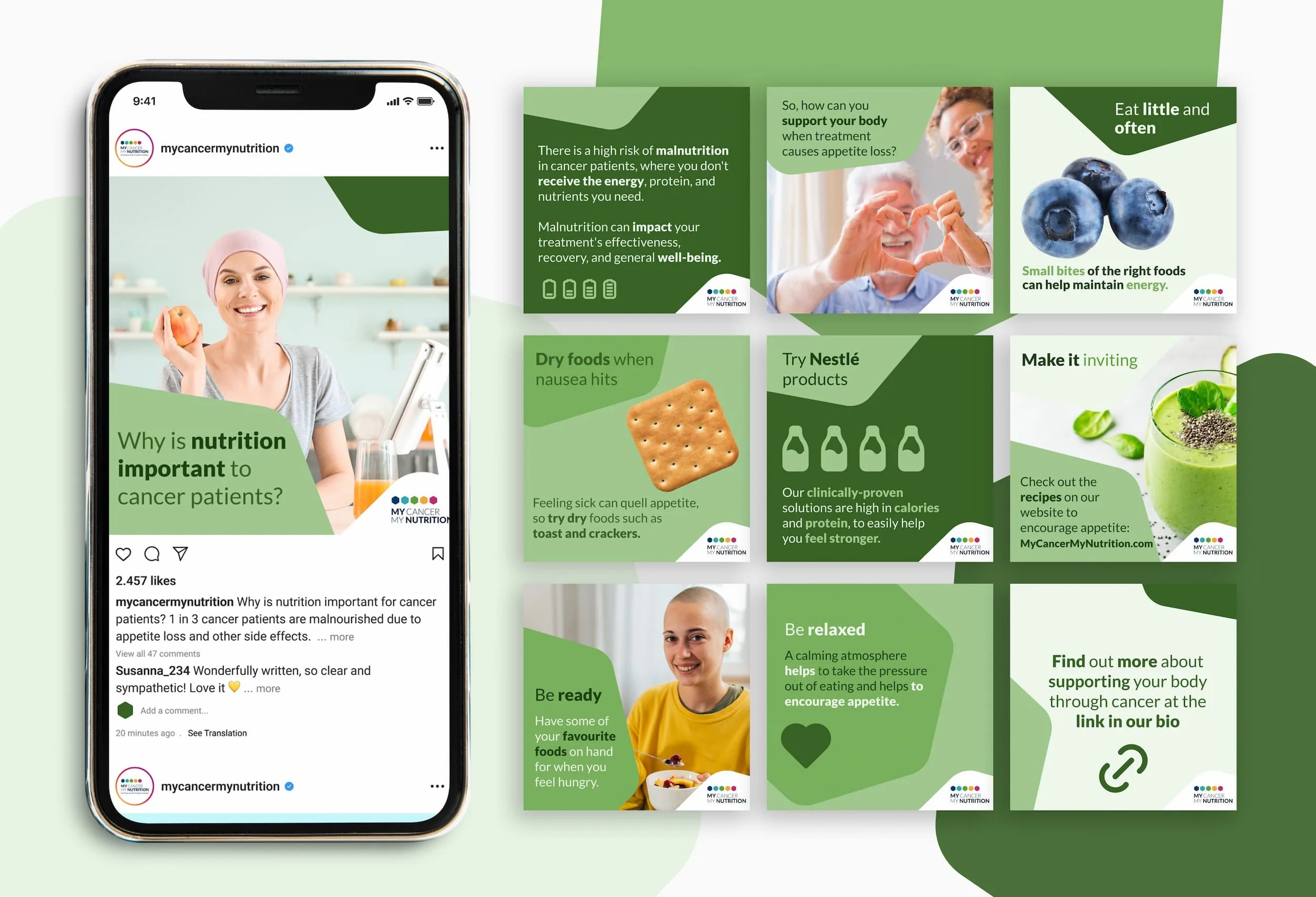 Kunden stod overfor udrulning af fem kampagner på sociale medier, målrettet både kræftpatienter og deres plejere på tværs af flere lande og kontinenter. Formålet var at skabe opmærksomhed om “My Cancer My Nutrition” og engagere brugere med relevant og støttende indhold.